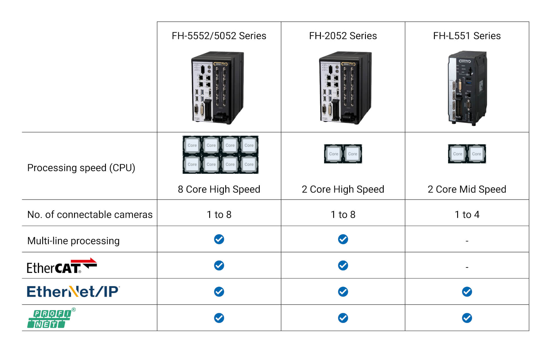 Medium | Intel® Celeron® | Windows 10 IoT Enterprise 2019 LTSC - 64 bit | 8 GB RAM (non ECC) | No | No | 8 | No | EtherCAT Slave, EtherNet/IP, Ethernet TCP/IP, PROFINET Slave, Serial RS-232C, USB | PNP/NPN | 2D Robot guidance, AI fine matching, Bead inspection, Code reading, Code verification, Color inspection, Counting, Defect inspection, Measurement inspection, OCR / OCV, Presence / Absence | FH medium speed & performance controller 2-core, NPN/PNP, 8 cameras, W10 IoT Enterprise LTSC 2019 64bit |